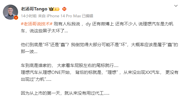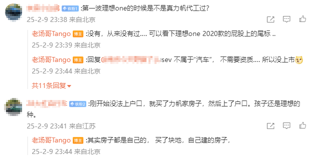 有网友询问:第一波理想ONE的时候,是不是力帆代工过?汤靖回应称:没有,从来没有过,可以看下理想ONE 2020款屁股上的尾标。 还有网友拿这件事进行比喻:“刚开始没法上户口,就买了力帆家房子,然后上了户口。孩子还是理想的种。”汤靖则解释称:其实房子都是自己的,买了块地,自己建的房子。